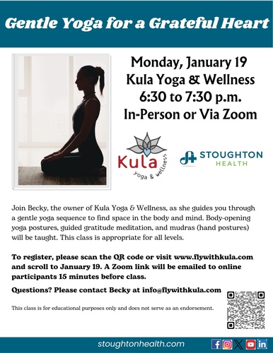 Join Becky, the owner of Kula Yoga & Wellness, as she guides you through a gentle yoga sequence to find space in the body and mind. Body-opening yoga postures, guided gratitude meditation, and mudras (hand postures) will be taught. This class is appropriate for all levels.