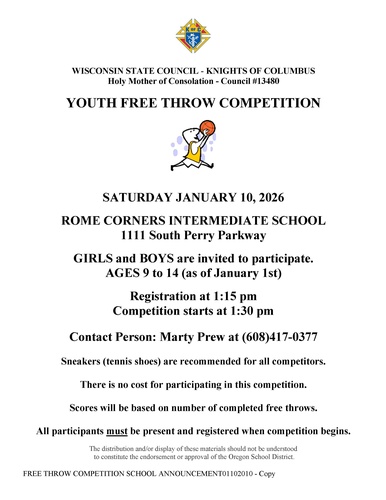 Sponsored by Knights of Columbus HMC Council 13480 and open to girls and boys ages 9 to 14(as of January 1st) Registration at 1:15pm Competition start at 1:30pm